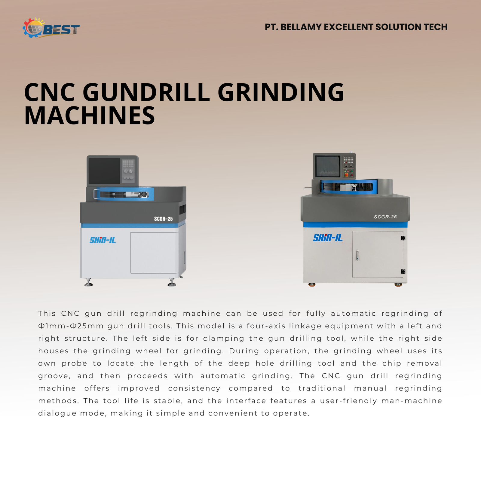 The Shin-il CNC Gundrill Grinding Machine extends tool life and reduces tooling costs. It is ideal for manufacturers using gundrill tools in automotive, mold, hydraulic, and precision machining industries.