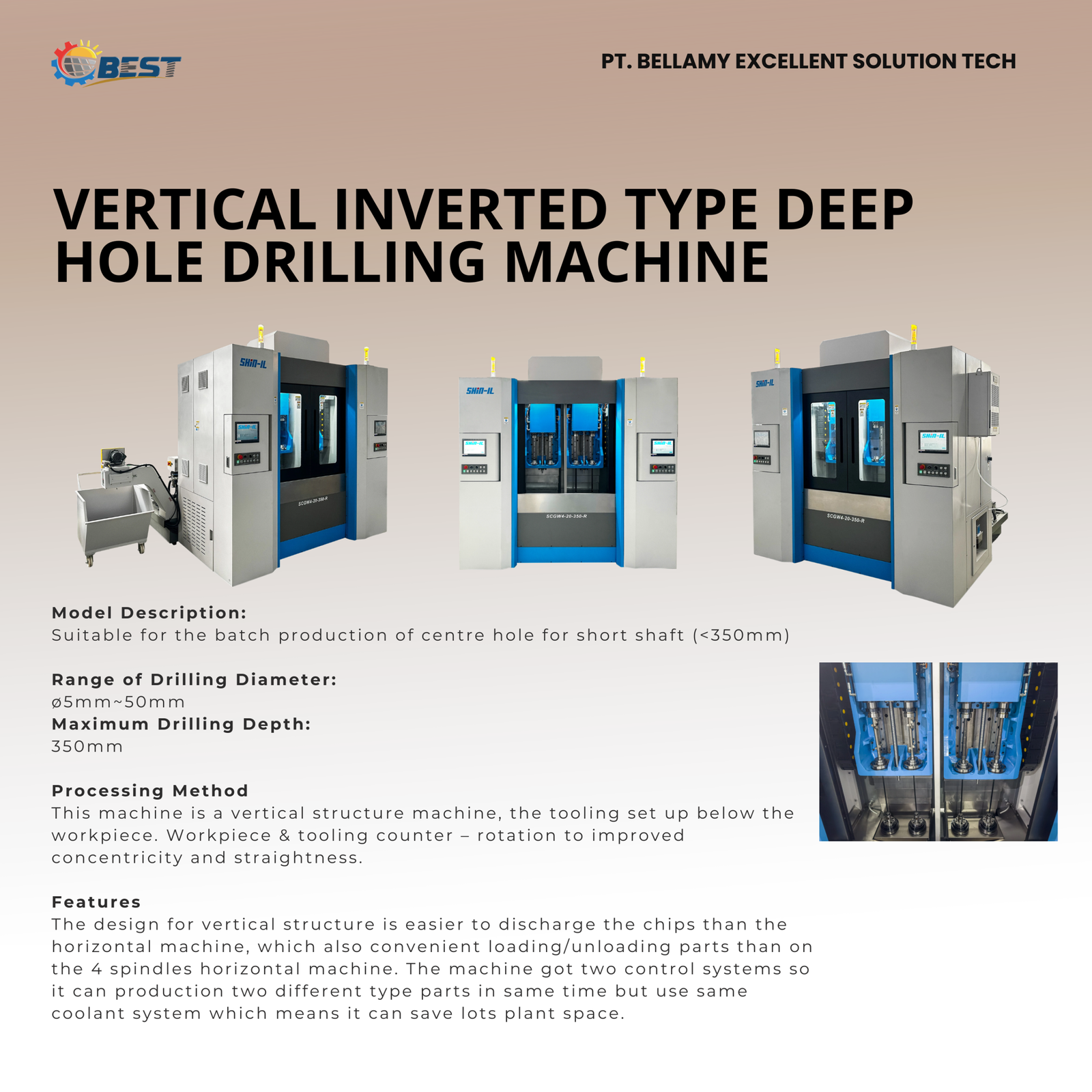 The spindle is positioned in an inverted vertical structure. Gravity assists with chip removal during operation. This reduces clogging and improves hole straightness.